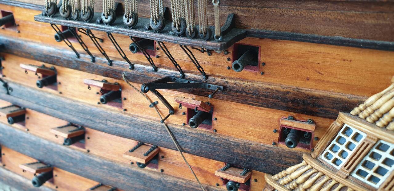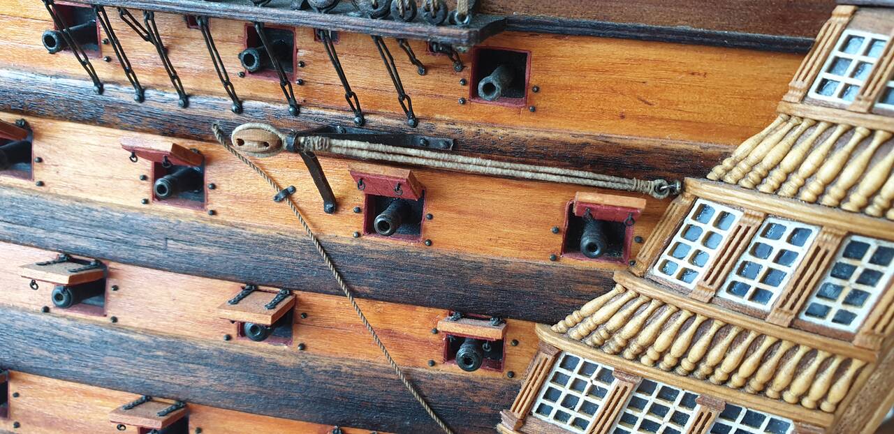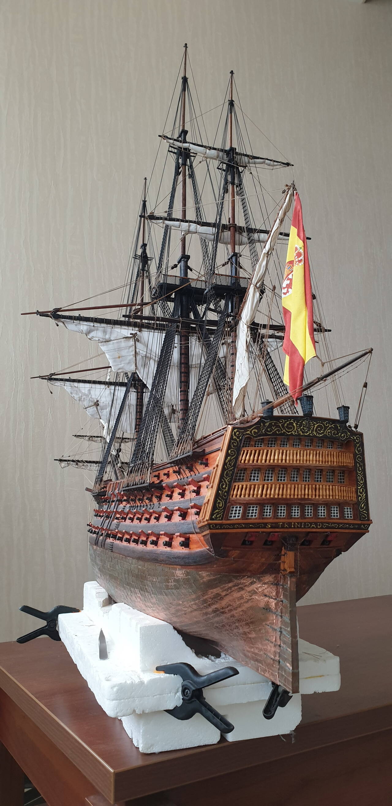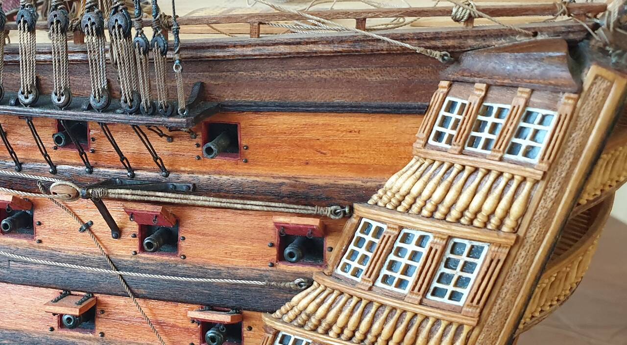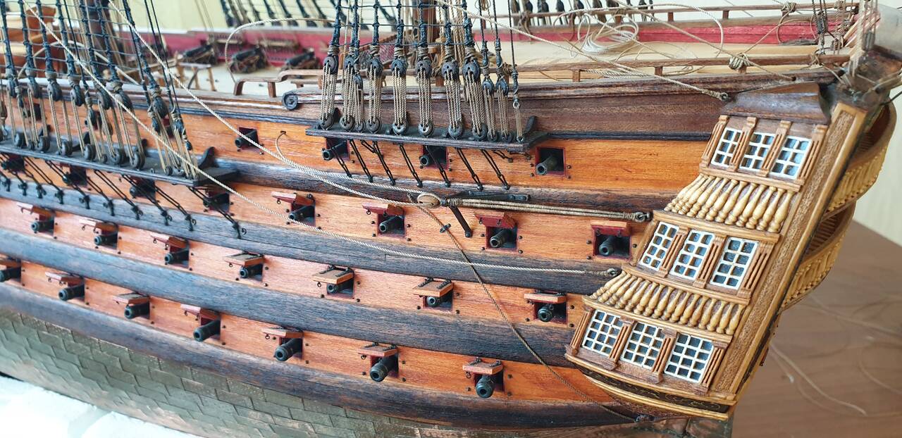 Немного об истории судна. Как уже касался выше корабль построен в Гаване (Куба) в 1769 г. официальное название Santisima Trinidad y Nuestra Senora del Buen Fin и первоначально имел 120 пушек. Позже его огневая мощь была увеличена до 144 пушек на четырех палубах. Многие годы Santisima Trinidad был крупнейшим военным кораблем в мире, значительно превосходя своего английского конкурента HMS Victory и был не намного, но всё же больше французского Bretagne. Длина 59 метров, длина по килю 51 метр, ширина 16 метров.