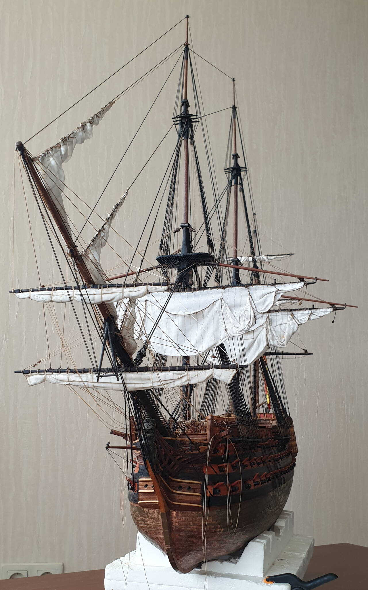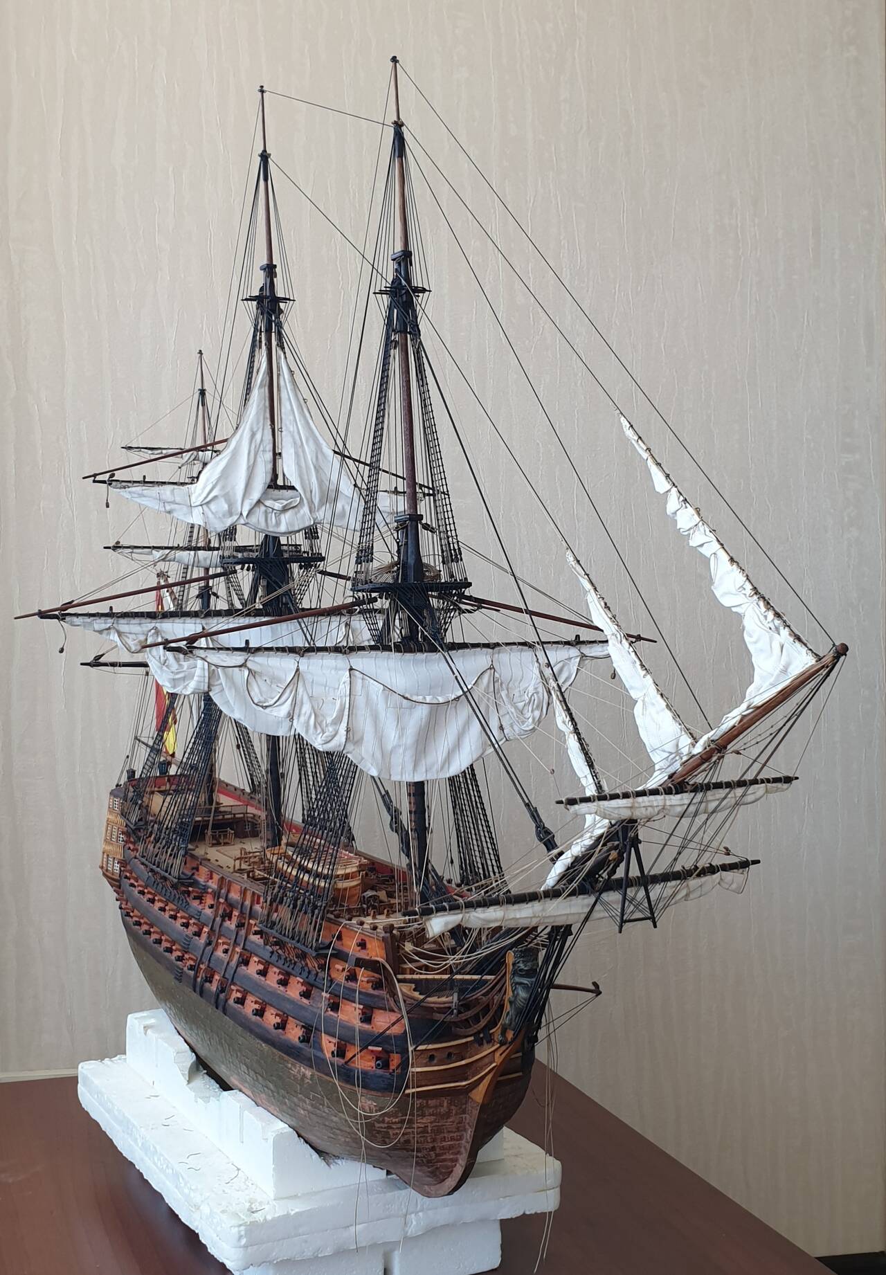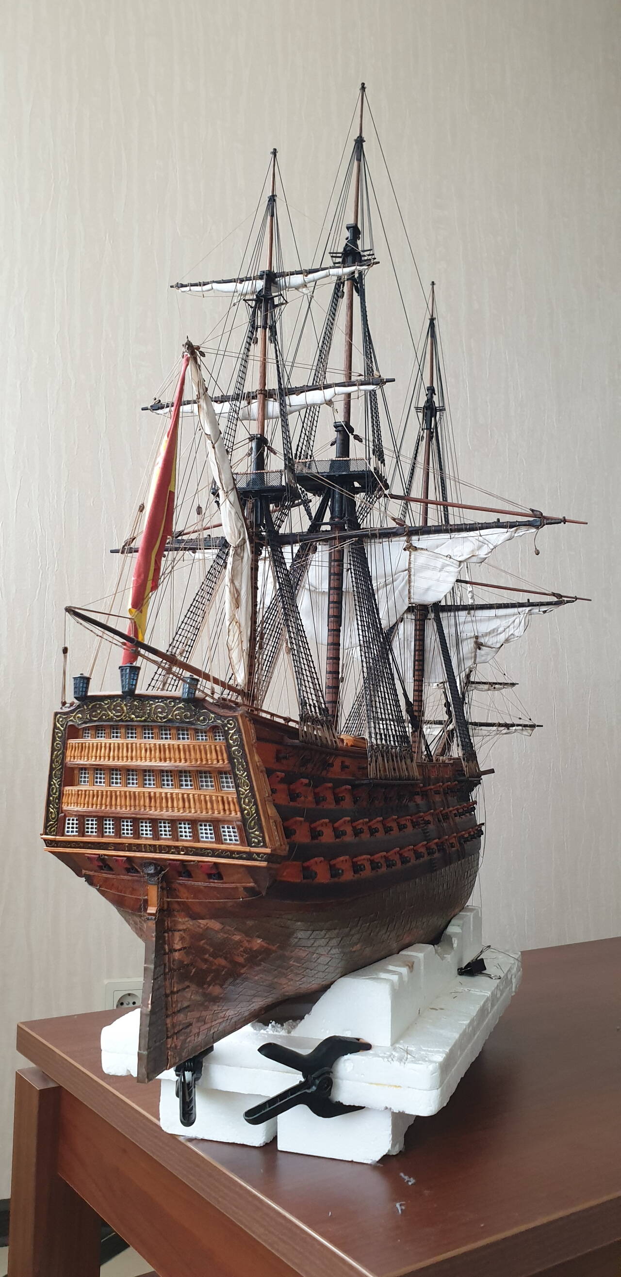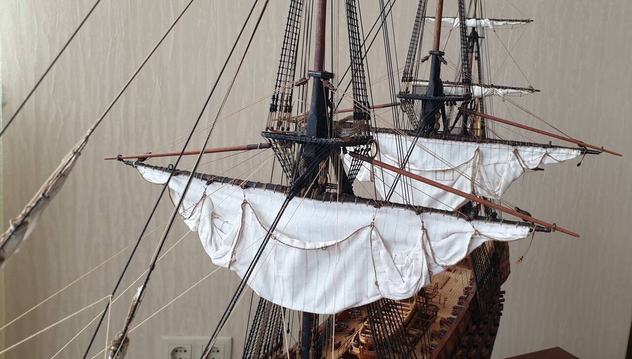 В корабельном моделизме я новичок, но великолепие парусных судов всегда очаровывала. Когда ДэАгостини выпустила Сан Джованни Батиста, я как говориться загорелся, купил первый номер и приступил к его сборке. Конечно марафон длинной в два с лишним года меня не особо устроил. Пришлось кое что переделывать, скупость производителя на нитки вообще не поддается ни какому описанию..... но я его закончил, и сейчас он является очень неплохим украшением квартиры