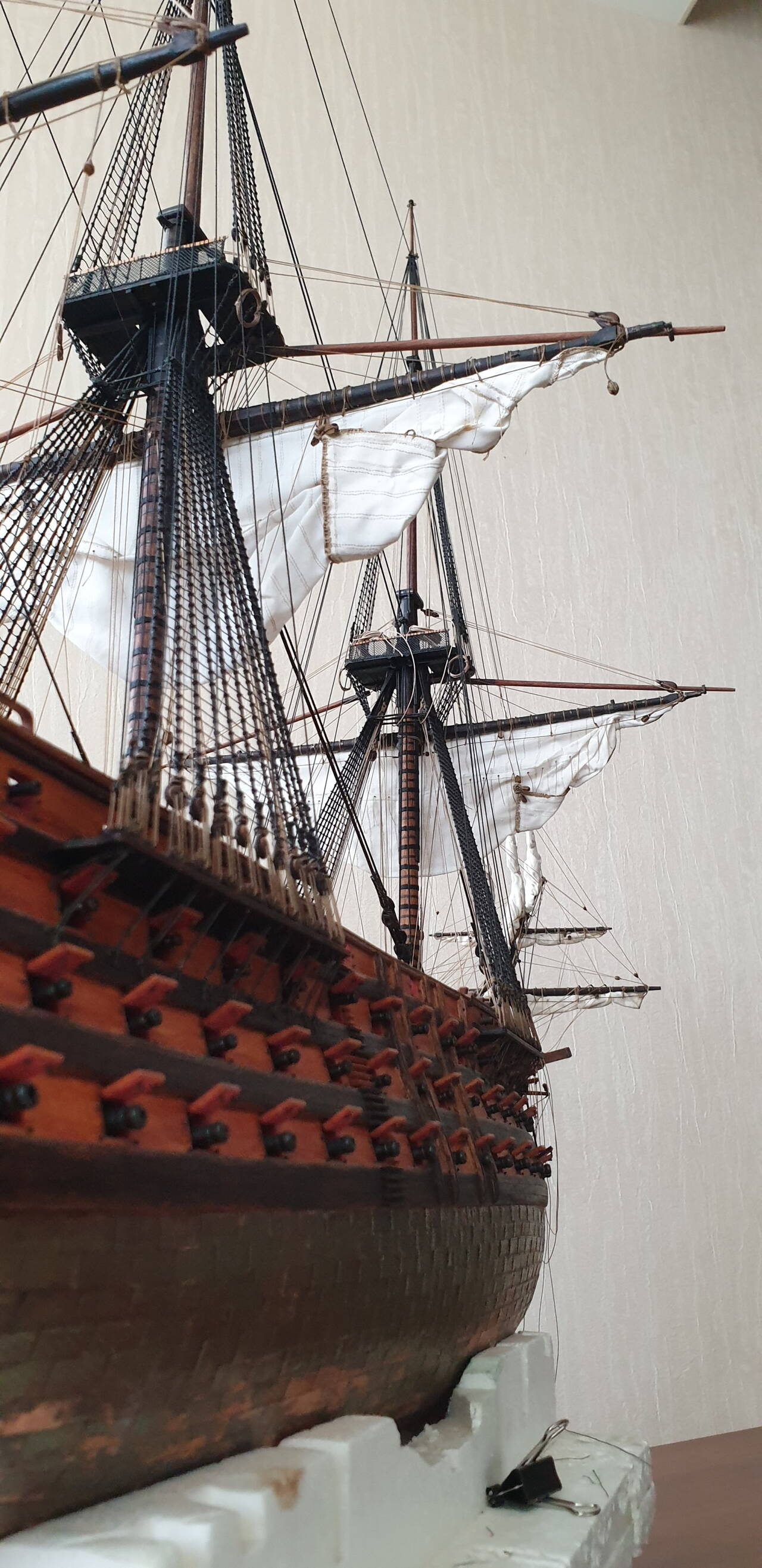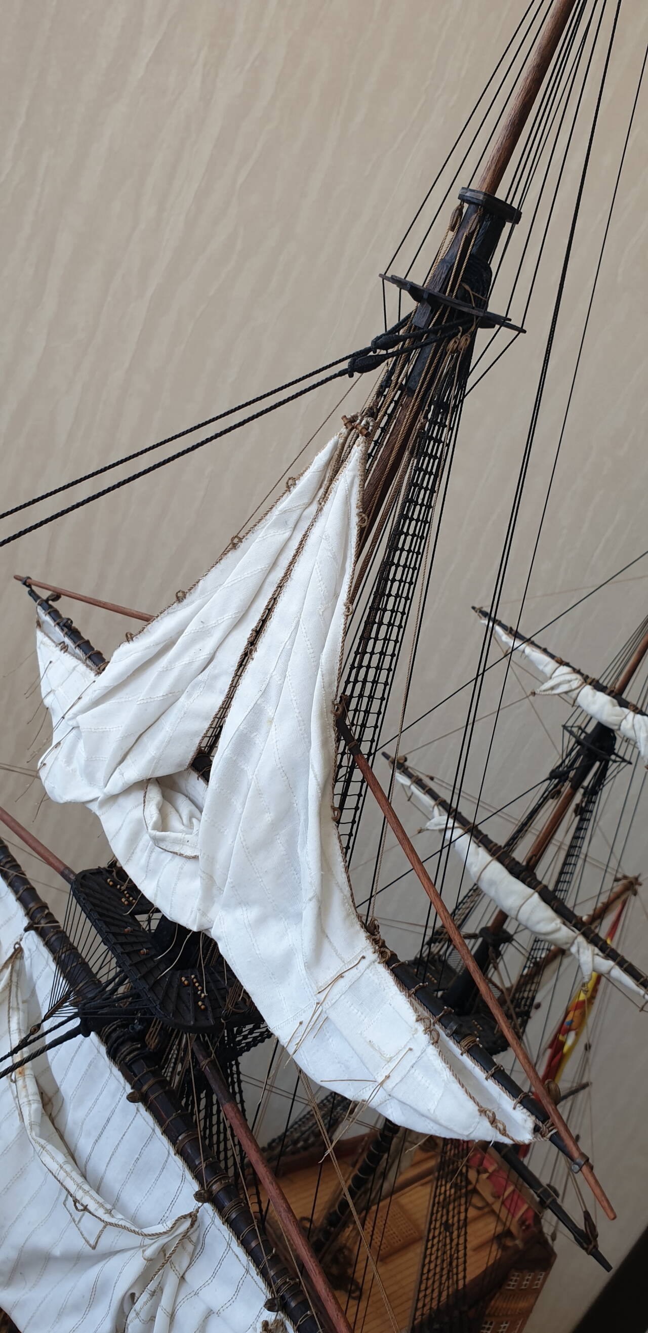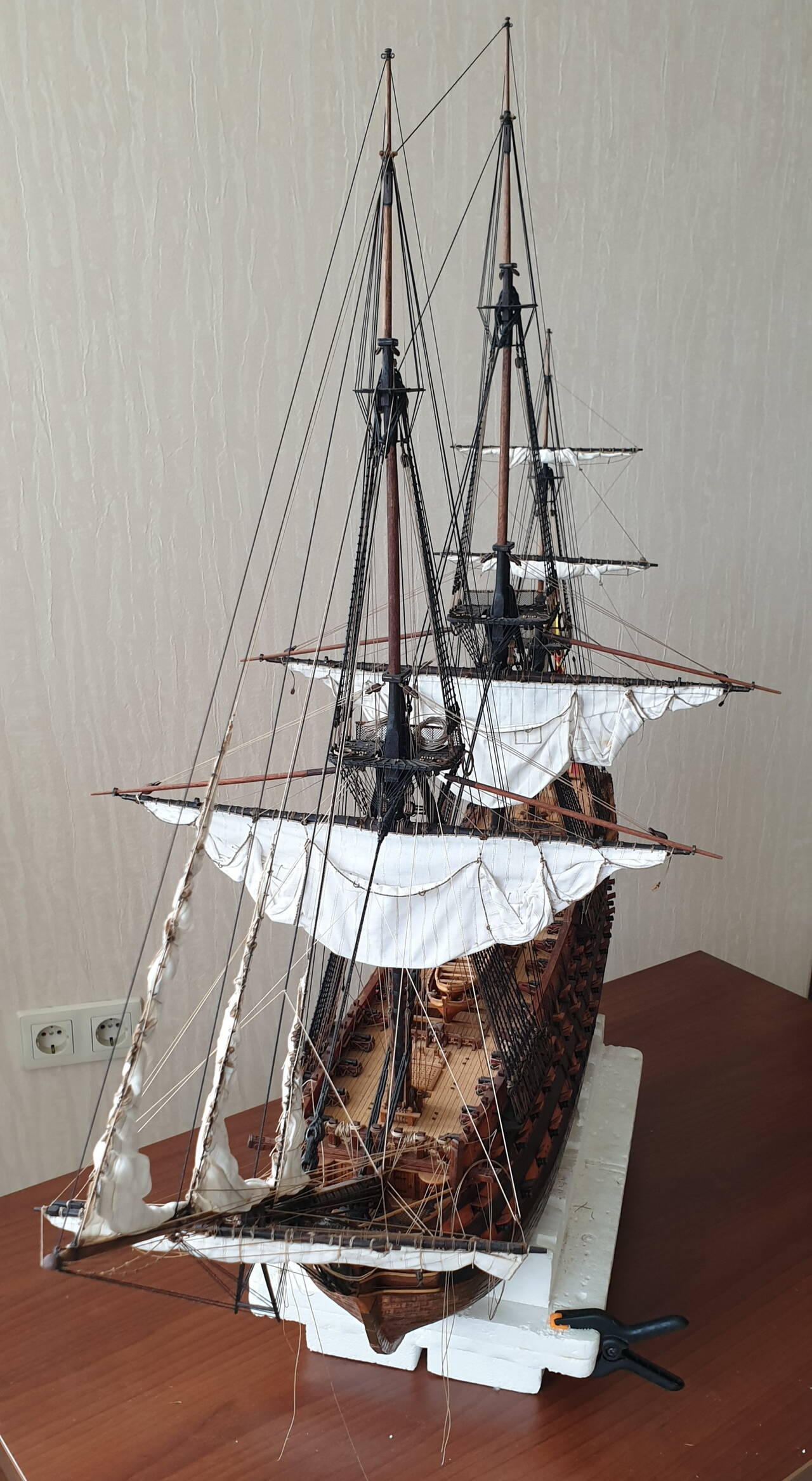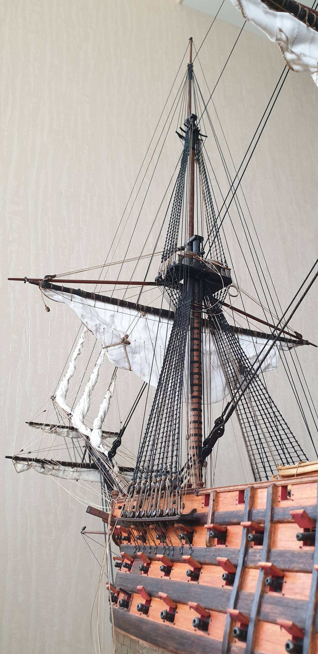 В корабельном моделизме я новичок, но великолепие парусных судов всегда очаровывала. Когда ДэАгостини выпустила Сан Джованни Батиста, я как говориться загорелся, купил первый номер и приступил к его сборке. Конечно марафон длинной в два с лишним года меня не особо устроил. Пришлось кое что переделывать, скупость производителя на нитки вообще не поддается ни какому описанию..... но я его закончил, и сейчас он является очень неплохим украшением квартиры
